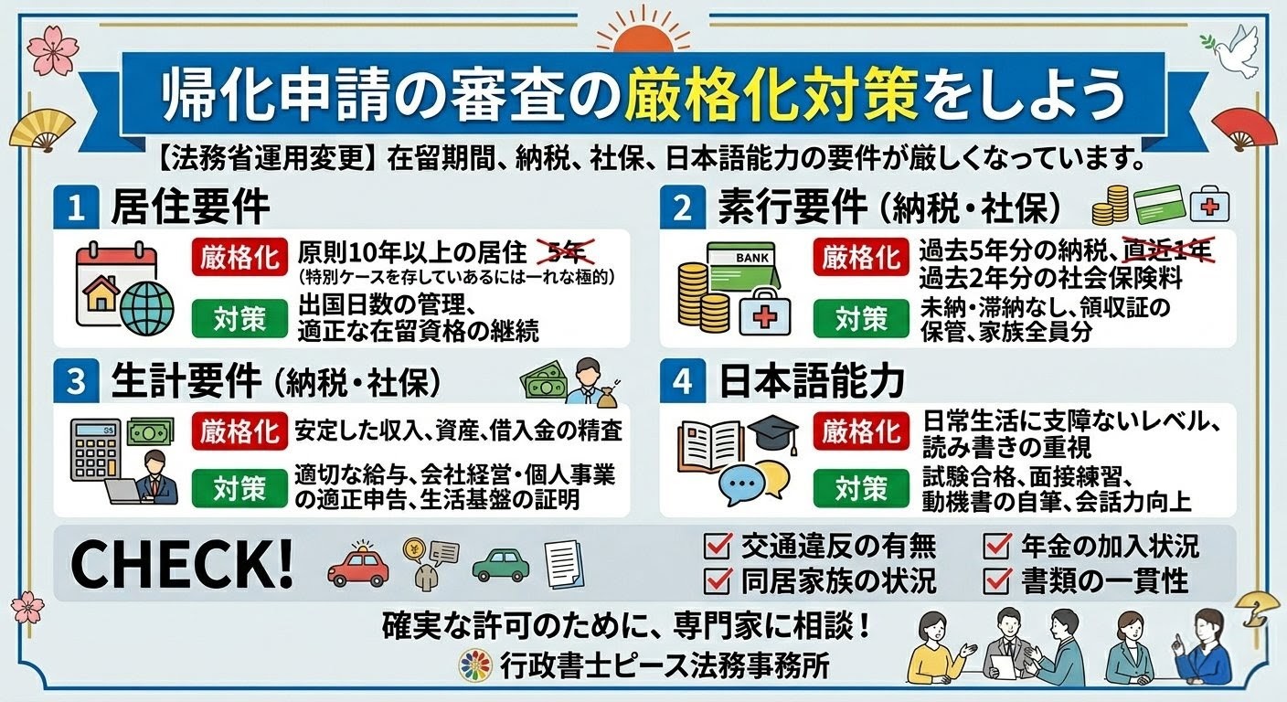 - 対策: 2026年以降、永住・帰化ともに日本語能力の要件化が進む見込みです。